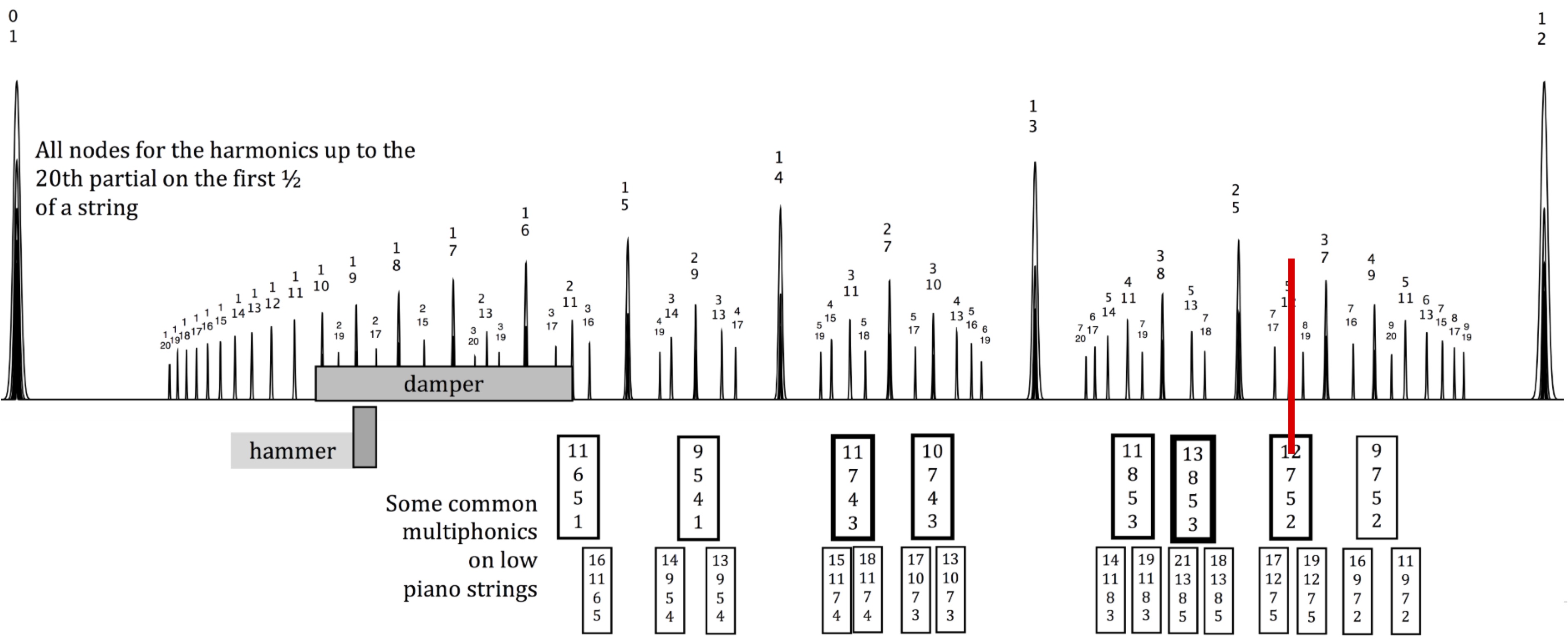 Several years ago2, when I began to study the structure of the frequencies present in multiphonics on vibrating strings3, it occurred to be that the partials (integer multiples of the frequency of the fundamental pitch of the string) in a given multiphonic seemed to follow some sort of orderly mathematical structure. Often it was the case that it was possible to discern a four-note chord by ear, and these chords consisted of two central frequencies and two additional pitches that represented the sum and the difference of these central frequencies. Adjacent to such a multiphonic, the point of contact on the string for two further multiphonics can be found. In these neighboring multiphonics, the sum tone of the first multiphonic becomes one of the central tones (accordingly, the partial numbers increase). By continuing this processes step by step, I determined that the location of points of contact for multiphonics, represented as fractions of the total string length, can be mapped across the entire length of the string. I then developed an algorithm that is able to compute all the possible sounds in an idealized system (the actual limitations imposed by various parameters in a physical system were not considered in this model). I named this algorithm the fraction windowing algorithm. The ‘multiphonic maps’ of piano strings, which were based on this algorithm, have in the meantime become an important basis for composing and performing music with these sorts of multiphonics. Moreover, the algorithm makes it possible to find the point of contact for a multiphonic when only two of the sounding components are known by running the algorithm backwards. This too is of course a very useful practical tool for composers and performers when working with these multiphonics. The fraction windowing algorithm is a mathematical tool that does not take into consideration the physical limitations of instruments, such as the fact that it possible to hear very high partials in the sound depending on the material the string is made of, how it is excited, its length, thickness, and tension.