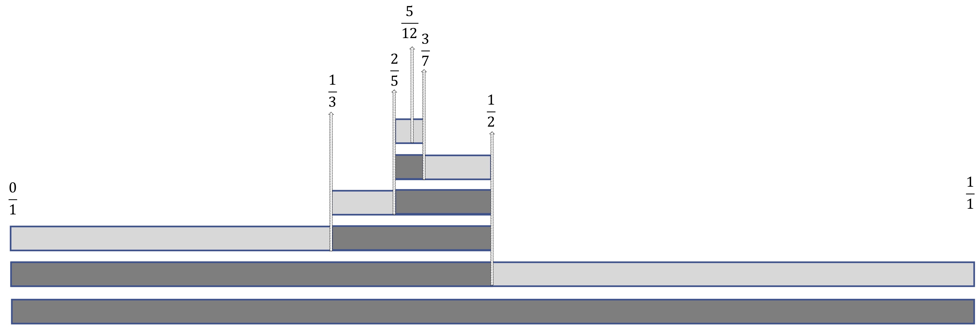 By running the algorithm backwards using a subtraction procedure6, it is possible to calculate the numerators of two fractions whose denominators are known. Between any two natural numbers, there are always exactly two of these pairs of fractions arranged symmetrically about the halfway position of the two natural numbers that form the frame boundaries (in the case of our string with a range of 0 to 1, the halfway point is
