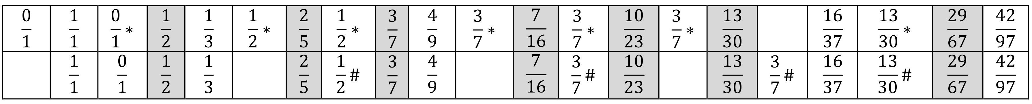 #) These terms are the fractions resulting from running the calculation backwards that are not shown. They replicate fractions that occurred earlier in the sequences in cases with mutations. Gray fields indicate fractions after which mutations followed. In both sequences, the marked fractions are strongly connected with the mutations (shaded grey).