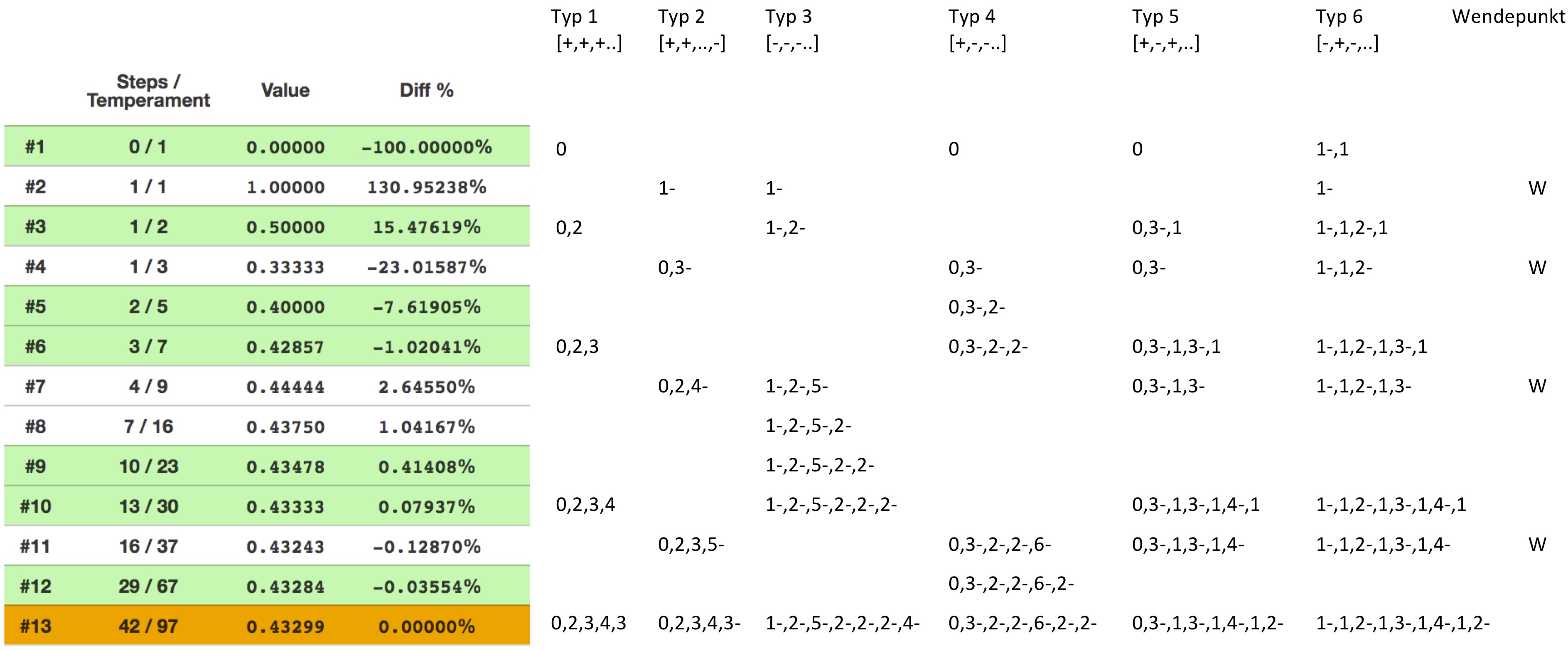 This discrepancy (as well as the structures of numbers in general) continued to be of interest to me. Thus, in the summer of 2017, I began to work more intensively on continued fractions. I am not a mathematician, and I do not pretend to have a clear overview of the state of research in this area. Therefore, it is quite likely that the ideas formulated here are already well-established in the mathematical literature. However, in the course of my research, I was unable to find many relevant sources9. Thus, I have tried to provide a starting point for a discussion in the form of a collection of continued fraction examples, which will allow someone who is familiar with the material to simply and quickly follow my line of reasoning. An essential goal of my investigation was the to find a type of continued fraction that includes all the fractions generated by my fraction windowing algorithm and no other fractions. I then proceeded to make a classification of several variant types until I identified such a type (type 10).