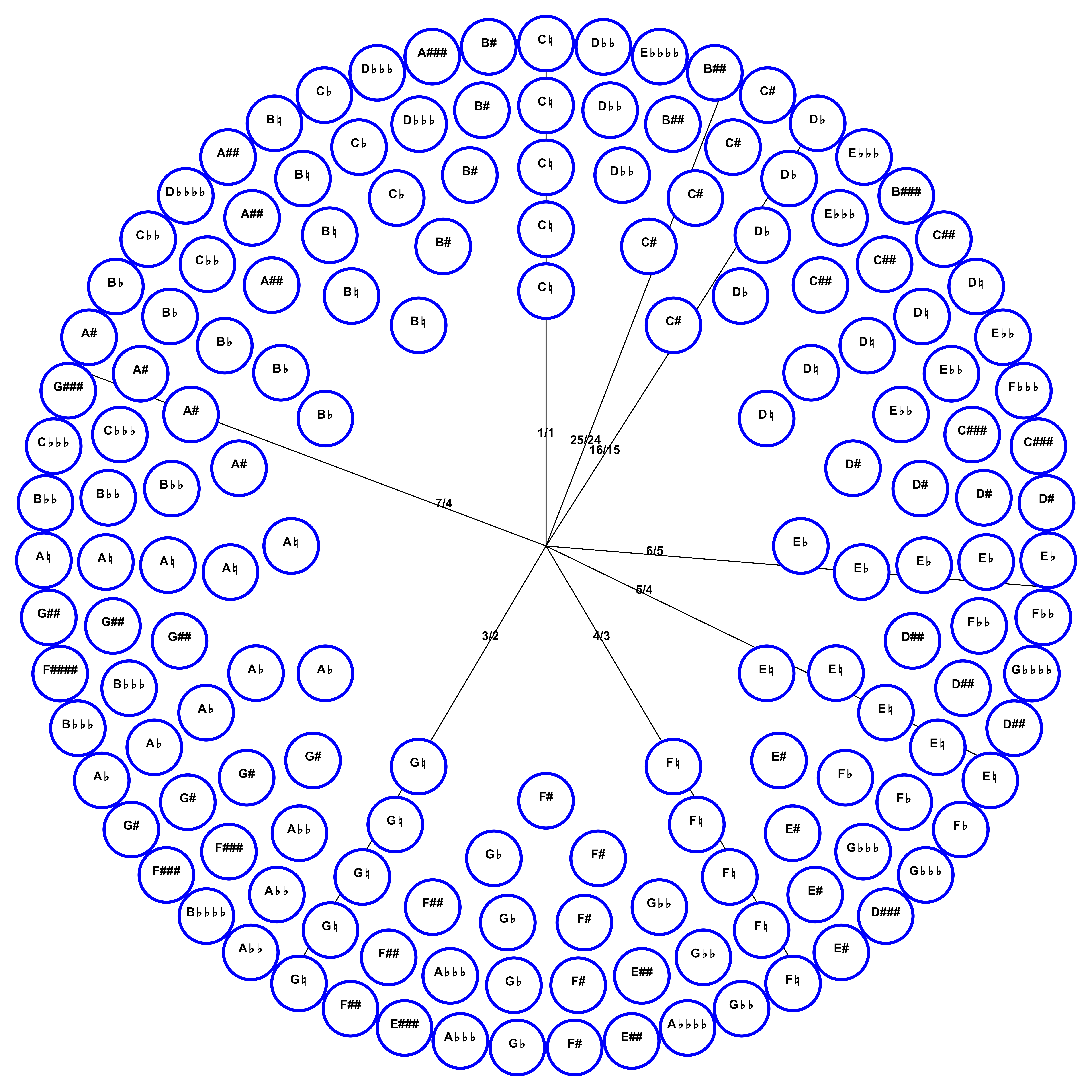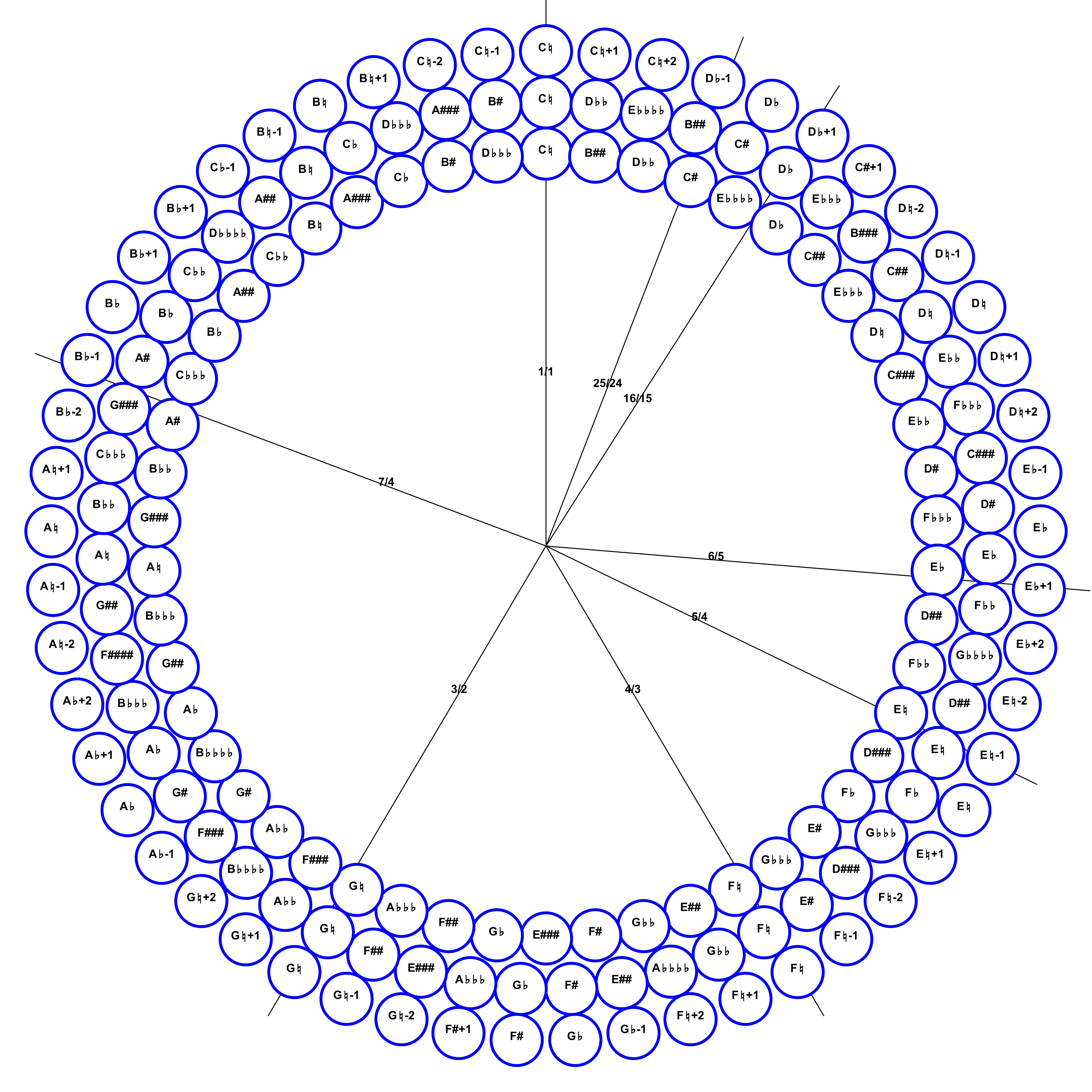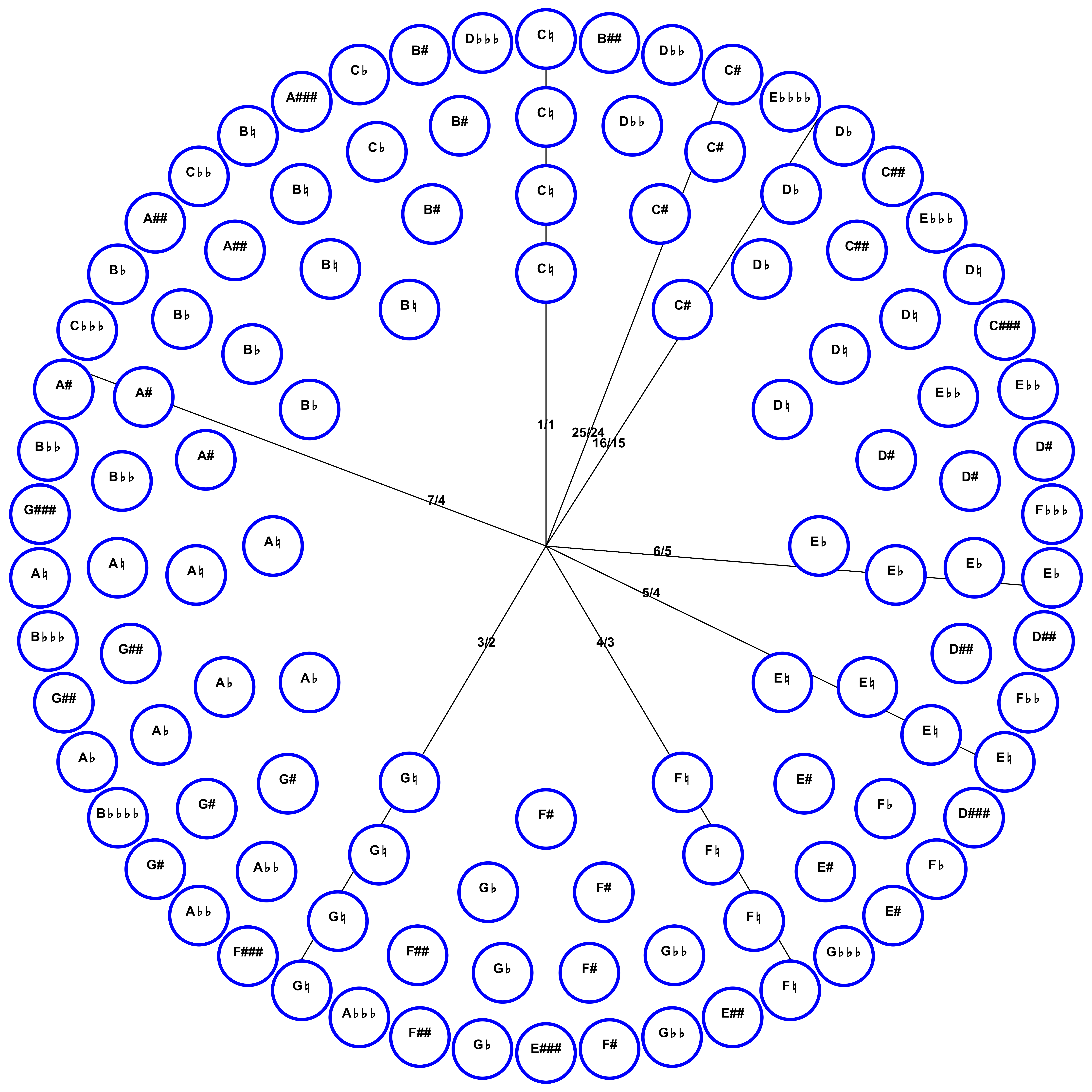 43-tone circle; circle of fifths from C♭♭♭ to C###