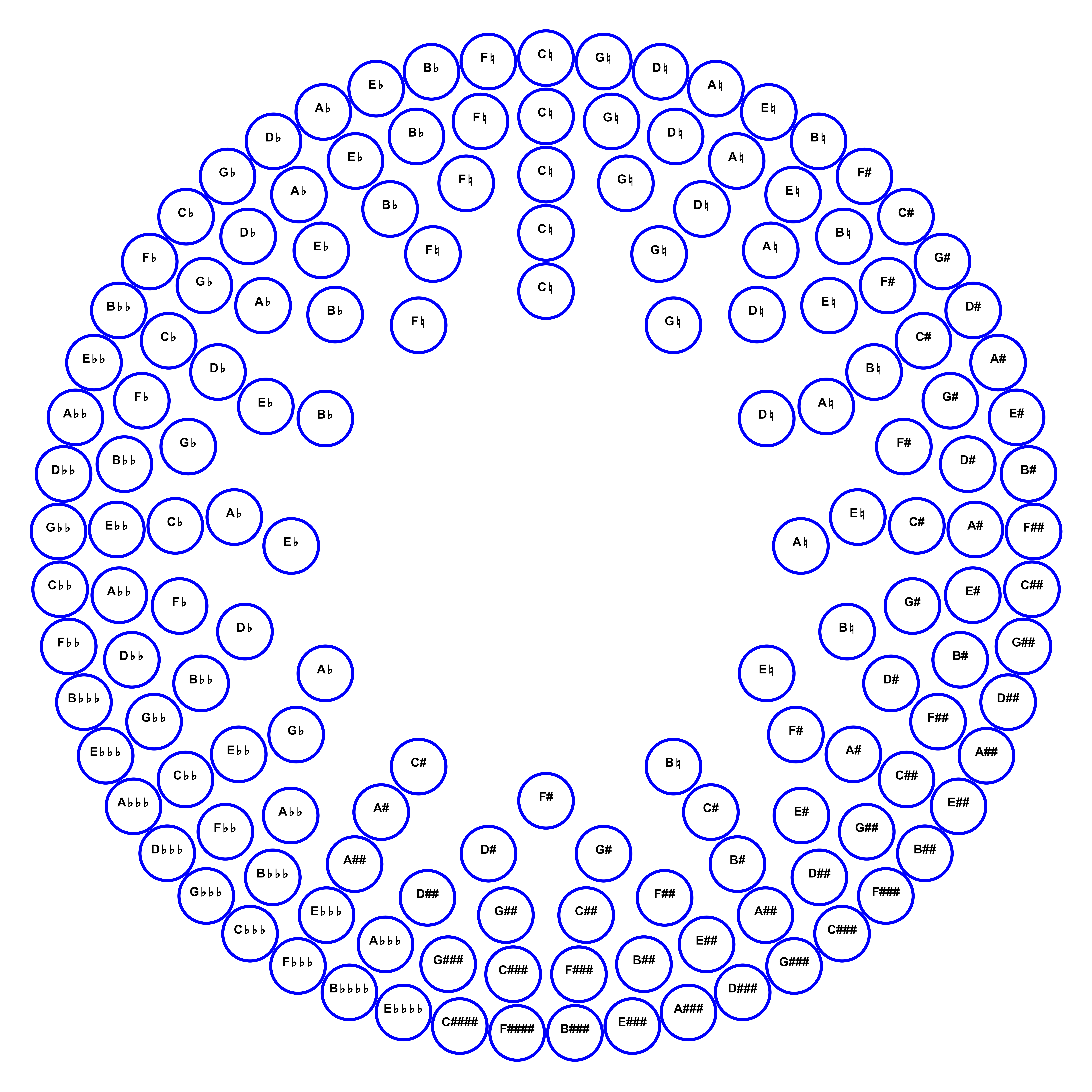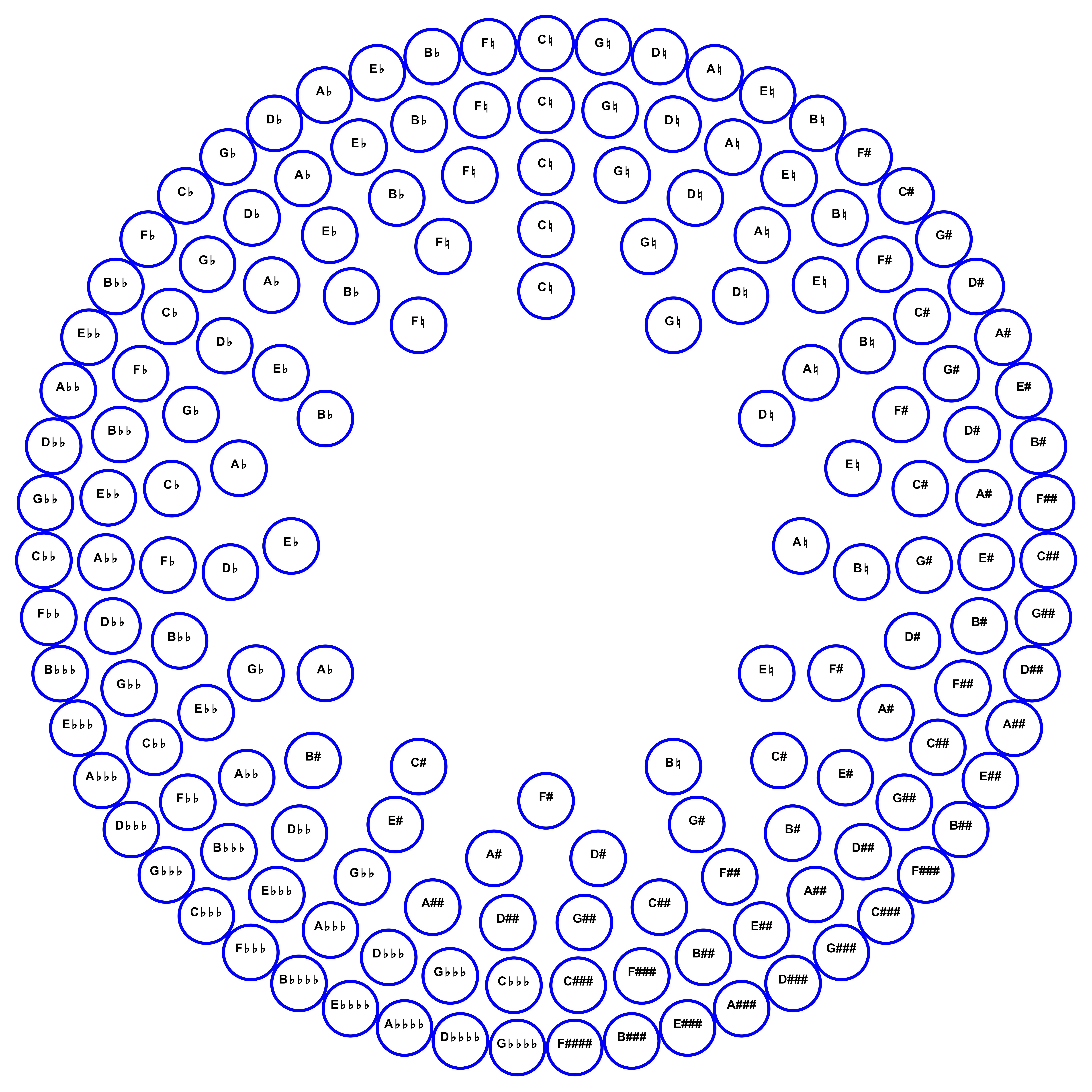 ["C♮", "G♮", "D♮", "A♮", "E♮", "B♮", "F#", "C#", "G#", "D#", "A#", "E#", "B#", "F##", "C##", "G##", "D##", "A##", "E##", "B##", "F###", "C###", "G###", "D###", "A###", "E###", "B###", "F####", "G♭♭♭♭", "D♭♭♭♭", "A♭♭♭♭", "E♭♭♭♭", "B♭♭♭♭", "F♭♭♭", "C♭♭♭", "G♭♭♭", "D♭♭♭", "A♭♭♭", "E♭♭♭", "B♭♭♭", "F♭♭", "C♭♭", "G♭♭", "D♭♭", "A♭♭", "E♭♭", "B♭♭", "F♭", "C♭", "G♭", "D♭", "A♭", "E♭", "B♭", "F♮"]